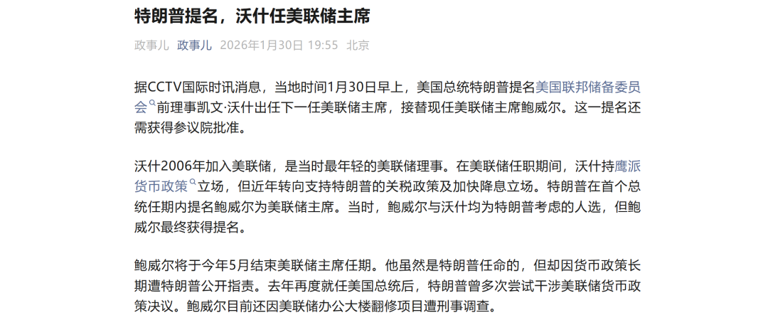 2026年1月30日晚间,美国总统特朗普宣布:已经提名凯文-沃什担任下一届美联储主席。