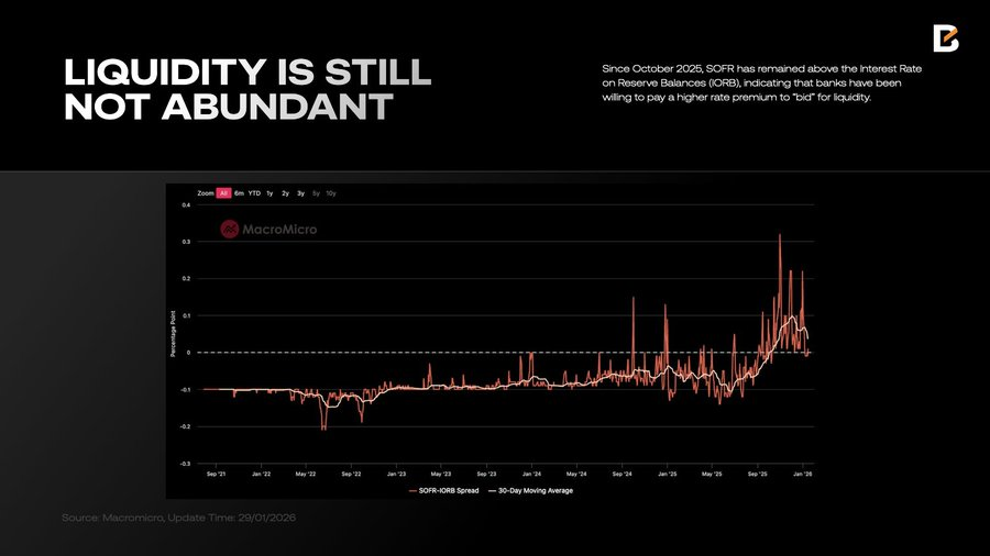 事实上,2025 年 9 月至 12 月,出于对劳动力市场的担忧,美联储确实实施了三次“防御性”降息,并宣布结束量化紧缩(QT)。但这并未带来投资者期盼的“流动性洪流”。从 10 月起,有效联邦基金利率(EFFR)逐渐向“利率走廊”中点移动,随后甚至越过中点漂移至走廊上限 — — 这绝非流动性宽松的迹象。