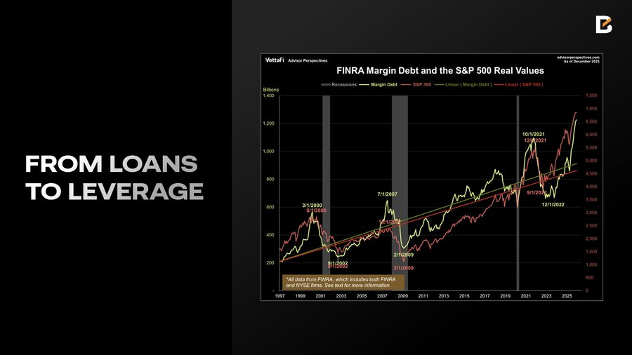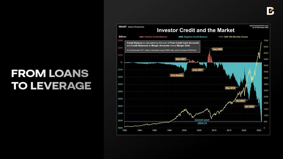 杠杆激增: 相比之下,保证金信贷(Margin Debt)逆势增长 36.3%,于 12 月创下 1.23 万亿美元 的历史新高;投资者的净借方余额也扩大至 -8141 亿美元,与保证金信贷的增长步调一致。