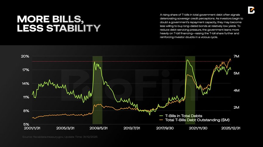 回购交易通常使用美国国债(T-notes)作为抵押品。但自 2023 年中期以来,短期国库券(T-bills) 的发行量和占比呈“指数级”增长。 这并非良性信号:T-bills 占比上升通常预示主权信用水平恶化。当投资者怀疑政府偿债能力时,政府被迫依赖短期融资,导致 T-bill 占比进一步升高,陷入恶性循环。