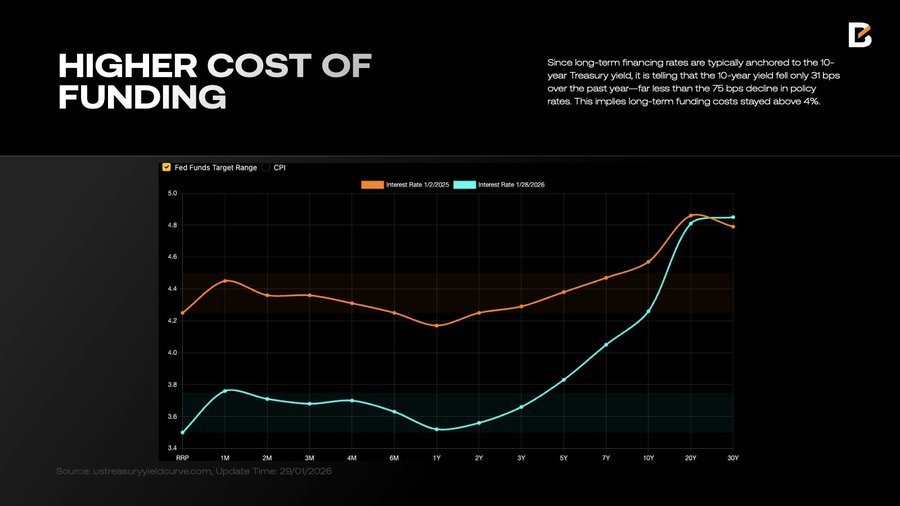 美元流动性质量下降的直接代价,是长期融资成本居高不下。随着美债规模激增(2025 年底达 38.5 万亿美元)及政策不确定性上升,系统性风险溢价随之走高。尽管政策利率下调了 75 个基点,但作为长期锚点的 10 年期美债收益率仅下降 31 个基点,这意味着长期融资成本仍顽固地维持在 4% 以上。