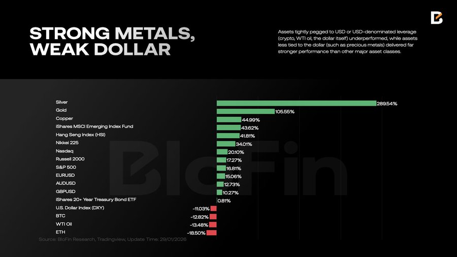 与此同时,2025 年见证了“严格分散化”策略的回归。与传统的 60/40 策略不同,流动性不再局限于美元资产,而是分散到了更广泛的标的中。事实上,投资者在全年稳步削减了美元及美元挂钩资产的份额。结果显而易见:与美元杠杆紧密绑定的资产(如加密货币、WTI 原油、美元本身)表现疲软,而与美元相关性较低的资产(如贵金属)则大幅跑赢其他主要资产类别。