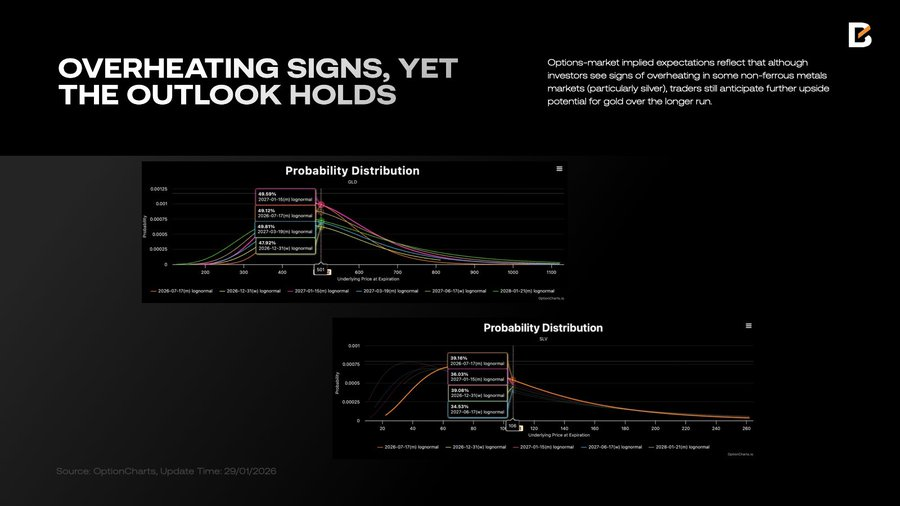 首先是资源(供给侧资产)。在安全优先的时代,增加大宗商品(金、银、铜)库存即使在非急需时也是理性的。这使得大宗商品不再仅仅是商业周期的镜像,而是具备了“供应受限资产”的属性。期权市场数据显示,尽管部分有色金属出现过热迹象,但交易员仍预期黄金在长期内有进一步上涨的潜力。