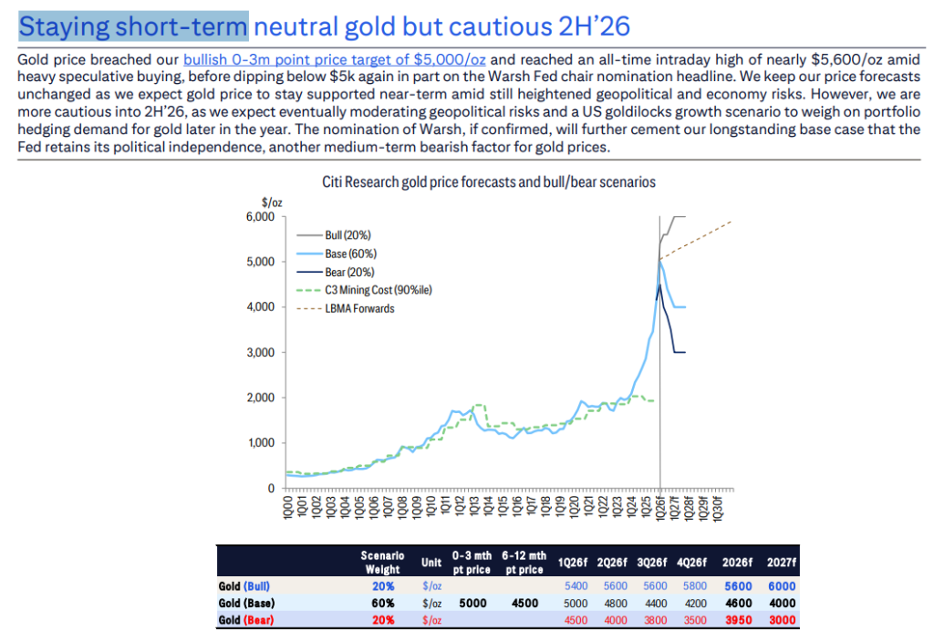 尽管短期内(0-3个月)花旗维持对金价的支撑看法,目标价看至5400-5600美元/盎司,理由是地缘政治和经济风险依然高企。但对于2026年下半年,花旗的态度转为明显的“谨慎”。