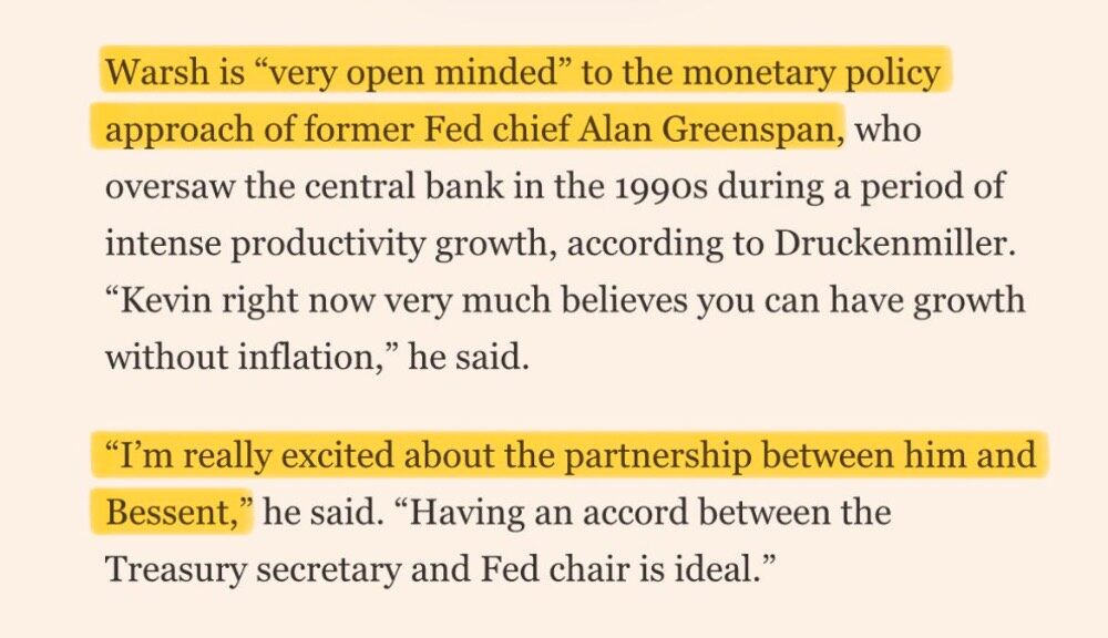 Warsh 的工作和任务就是执行格林斯潘(Greenspan)时代的策略。特朗普和贝森特都曾说过(此处不详述,但主方向降息),让经济保持热度,并假设人工智能带来的生产率提高将抑制核心 CPI 的上涨(就像 1995 年至 2000 年时代)。