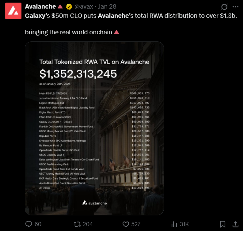 Galaxy通过Avalanche区块链完成一笔7500万美元链上信贷交易,其中5000万美元为机构投资者主投。该交易将私有贷款打包为链上发行并管理的数字证券,而非传统后台系统操作。