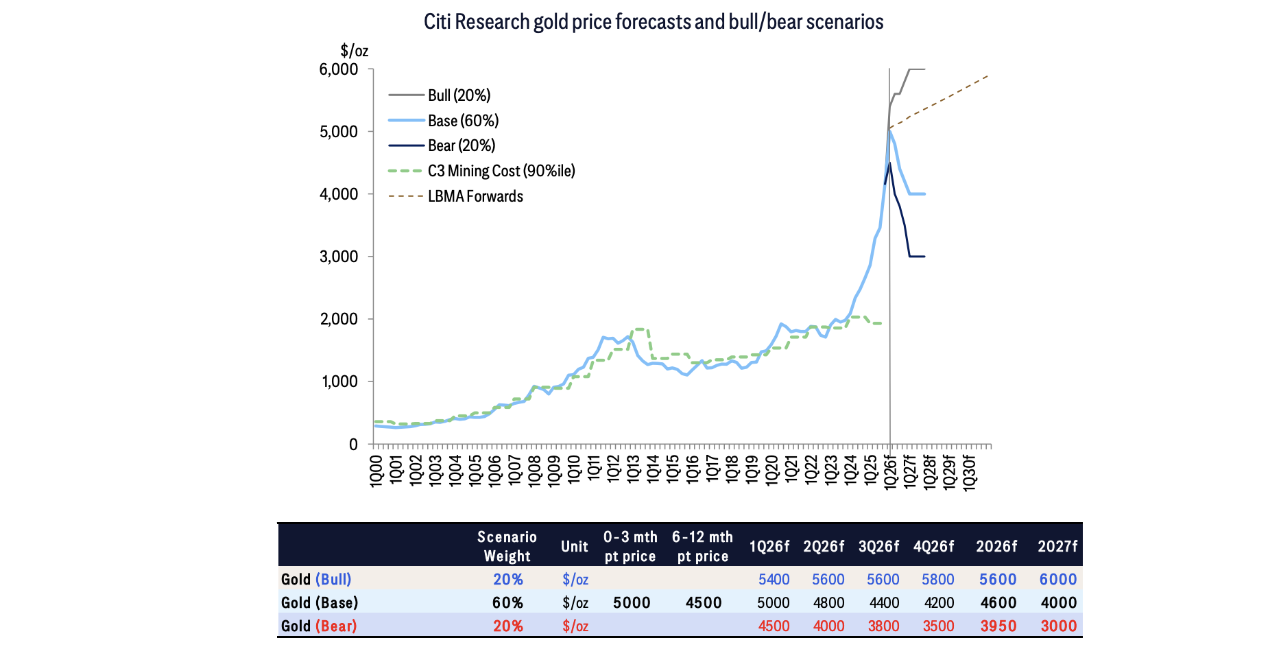 花旗给出三种情景:牛市情景(20%概率)金价升至6000美元;基准情景(60%概率)金价回落至4000美元;熊市情景(20%概率)金价跌至3000美元。