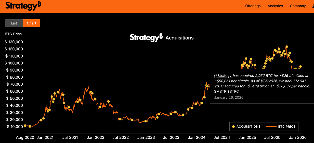 Saylor 的公司 Strategy(原名微策略),是全球持币最多的上市公司。今年 1 月,在比特币还在 9 万左右震荡时,他们又买了超过 3.7 万枚比特币,花了 35 亿美元。