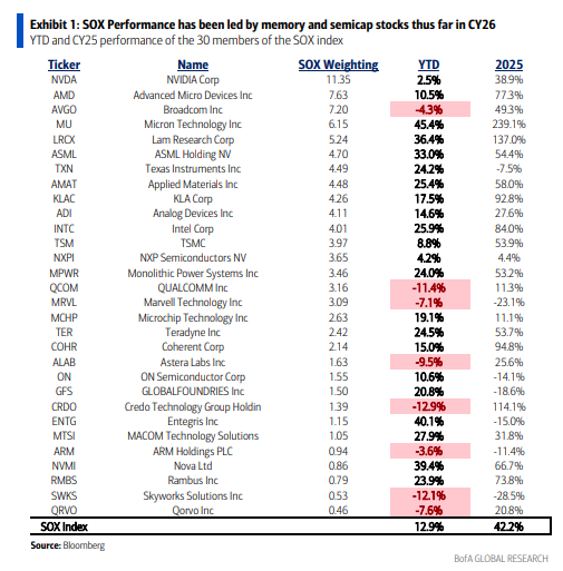 尽管市场对AI融资、估值和利率波动存在诸多担忧,芯片股今年开局表现稳健。费城半导体指数(SOX)年初至今上涨约13%,创下过去20年中第二好的1月表现,远超标普500指数仅1%的涨幅。值得注意的是,这轮上涨并非由计算领域龙头英伟达和博通推动,而是由存储芯片、半导体设备商以及模拟芯片厂商引领。