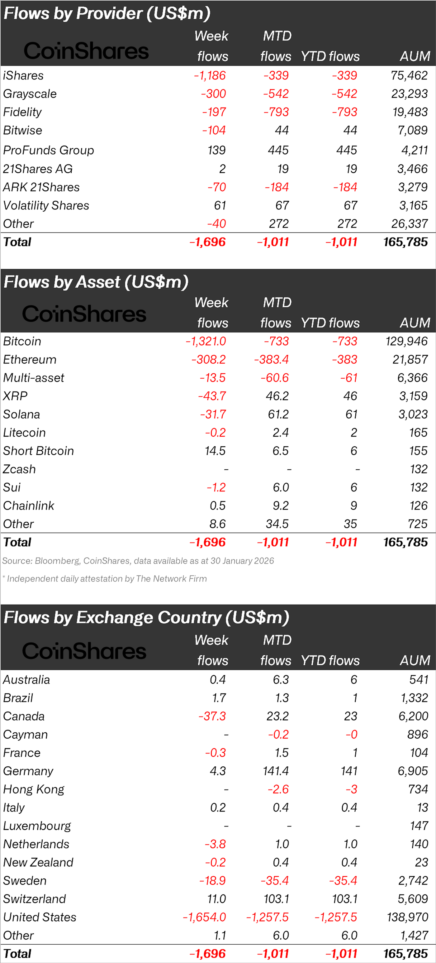 美国引领了资金流出潮,仅一周内就有约16.5亿美元从美国上市产品中流出。加拿大和瑞典也出现了显著的资金流出,总额分别约为3730万美元和1890万美元。