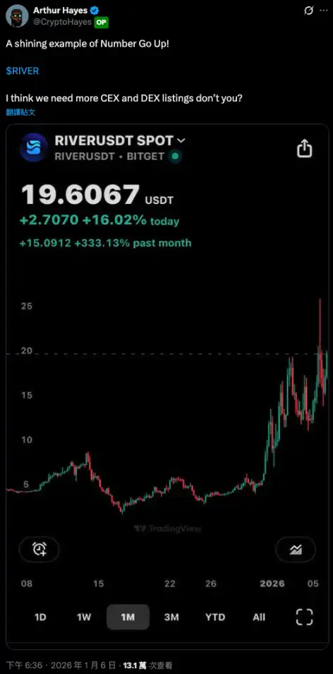 1 月 6 日,BitMEX 创始人 Arthur Hayes 公开呼吁 CEX 上线该代币,并预言其将迎来爆发。Hayes 的背书为 RIVER 注入了第一剂强心针,尽管当时大多数主流加密资产价格处于下行通道,RIVER 却开启了单边上涨模式,市值在短短几周内翻了四倍有余。