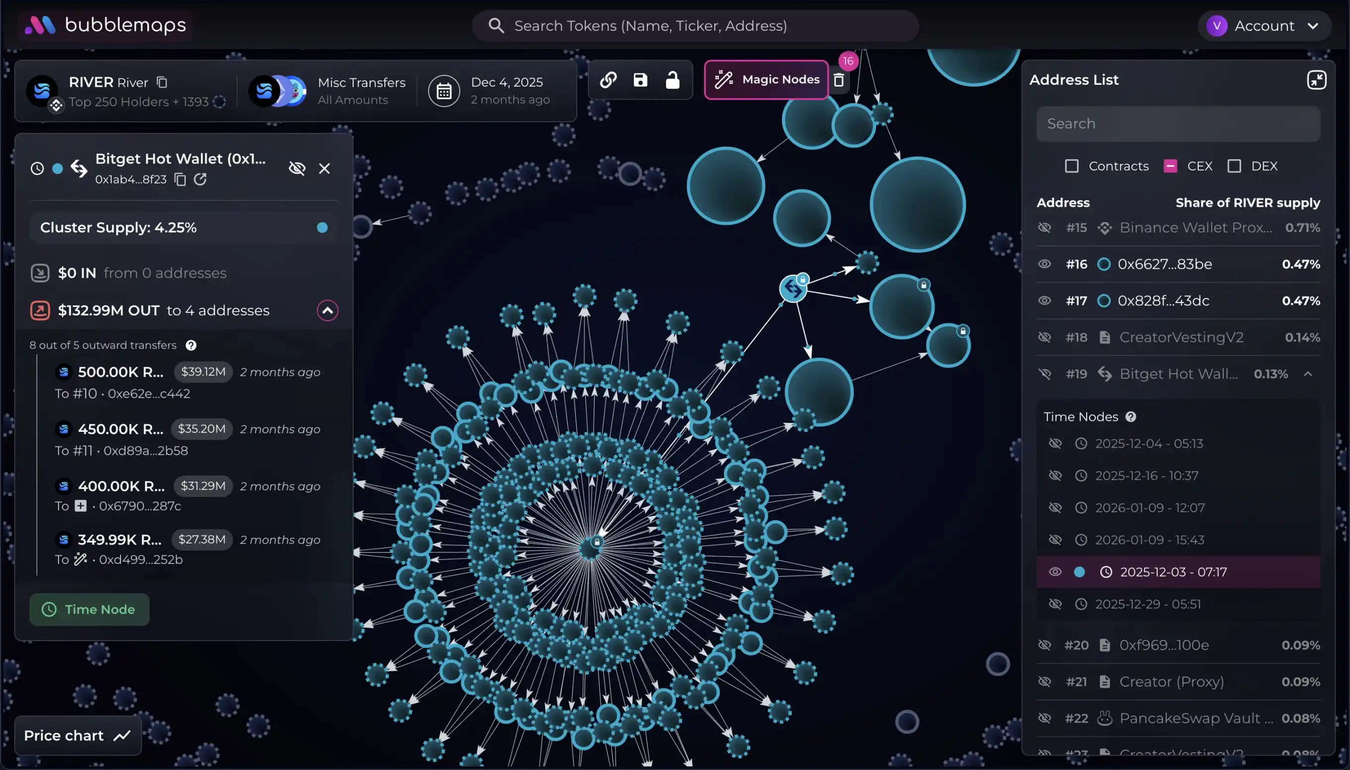 其中一个钱包 0x6790 在数百个钱包中分散了 40 万枚 RIVER。所有这些接收的钱包显示相似模式,之前没有任何活动,收到数量相近的 RIVER,于 1 月 9 日向 Bitget 发送代币,很可能是为了出售,由单一来源提供资金,且经过四层跳转。