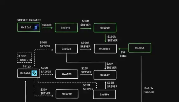 其指出,RIVER 在上线一个月后,有 7 个地址从 Bitget 提取了 2.30 亿枚 RIVER 代币,这些钱包此前没有活动记录,且在 12 月 3 日和 29 日紧密时间窗口内接收了代币。