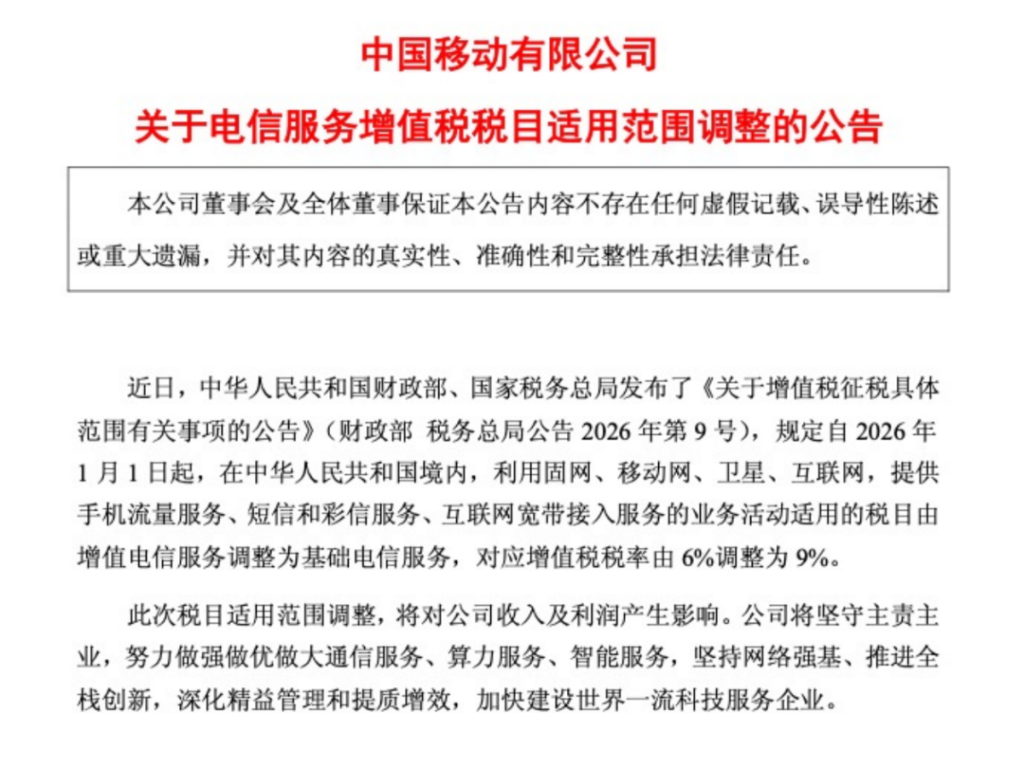 近日,财政部、国家税务总局发布《关于增值税征税具体范围有关事项的公告》(财政部 税务总局公告2026年第9号),规定自2026年1月1日起,在中华人民共和国境内,利用固网、移动网、卫星、互联网,提供手机流量服务、短信和彩信服务、互联网宽带接入服务的业务活动适用的税目由增值电信服务调整为基础电信服务,对应增值税税率由6%调整至9%。同时,三大运营商均在公告中提及,此次增值税税目适用范围调整,将对公司收入和利润产生影响。