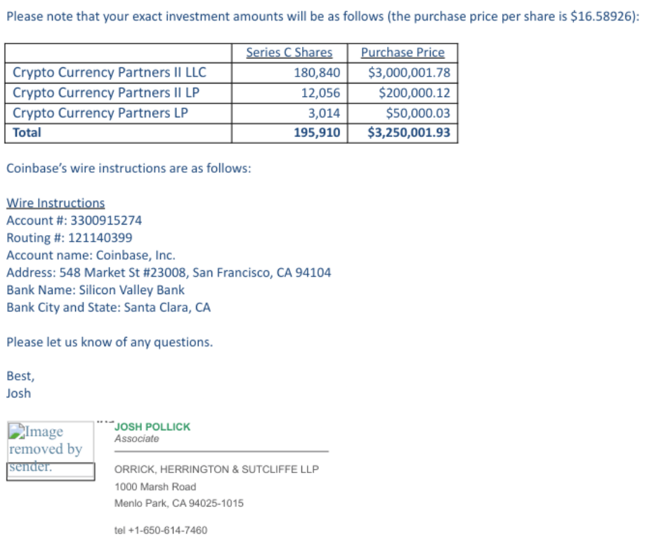 一个月后,在2月22日的邮件中,Blockchain Capital联合创始人Brock Pierce称Stephens“昨天已经为你在Coinbase的头寸打款1500万美元。所以你还留有1500万美元的股份,同时收回了500万美元现金,如无误的话。”