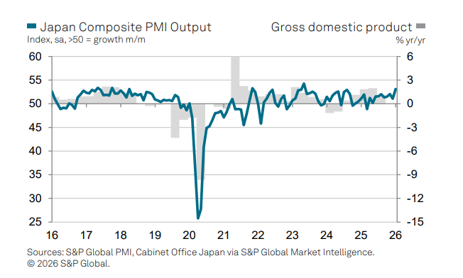 日本私营部门在2026年开局表现强劲,服务业与制造业需求同步回暖,推动综合PMI创下近三年来的最快增速。