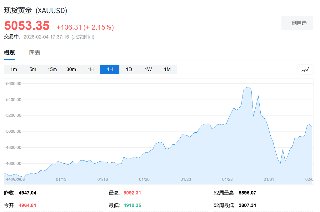 然而,市场迅速进入修复模式。随着投资者重新评估形势,现货黄金在周二强势反弹逾6%,收于每盎司4,946.81美元附近。反弹势头延续至周三早盘,截至美东时间凌晨3:45,现货黄金上涨约3%至5,079.4美元,纽约黄金期货更是跃升3.3%至5,093.80美元。
