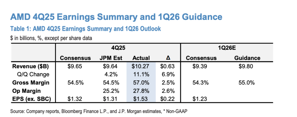 据摩根士丹利、高盛等多家华尔街投行分析,AMD第四季度实现营收103亿美元,同比增长34%,环比增长11%,显著超越市场普遍预期的96.7亿美元。然而,市场认为这一业绩中包含了约3.9亿美元的一次性特殊销售收入,剔除此因素后,其营收增长实质仅略高于业绩指引的上限。