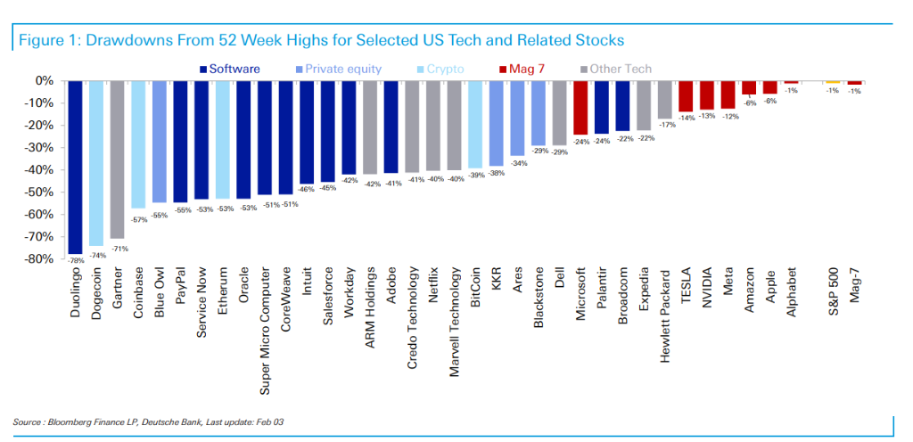 德银在报告中直言,虽然标普 500 指数仍接近历史高位,但这在很大程度上归功于资金向防御性板块的轮动以及个别科技巨头的异常表现。过去几个月,市场明显不再相信“每只科技股都是赢家”。在“真正的赢家与输家版图”下,不少与AI、软件、加密、私募股权敞口相关的标的出现“非常残酷的下跌”。