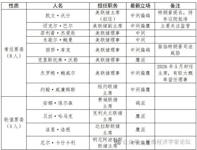 众所周知,FOMC成员包括7位理事和5位地方联储主席,这12名成员均为一人一票。今年5月中旬,沃什有较大可能接替鲍威尔担任美联储主席。届时,即便沃什愿意坚决执行特朗普的大幅降息的指令,其他理事和地方联储主席也未必会附和响应。从FOMC潜在的成员结构看,大致可以分为四类:第一类是“政策组合型”。本质上是制度性鹰派(担忧美联储资产负债表过大)与政治性鸽派(迎合特朗普降息要求)的矛盾结合体。其代表是沃什本人。第二类是主张“就业优先”的鸽派或中间偏鸽派。主要是理事库克、费城联储主席保尔森。第三类是强调“数据驱动”的平衡派或中间偏鹰派。除鲍威尔外,美联储副主席巴尔、理事杰斐逊、理事鲍曼、纽约联储主席威廉姆斯、明尼阿波利斯联储主席卡什卡利均在此列。第四类是“防通胀优先型”,即坚持长期价格稳定优先于短期就业波动的强硬鹰派。典型代表包括理事沃勒、克利夫兰联储主席哈马克、达拉斯联储主席洛根。