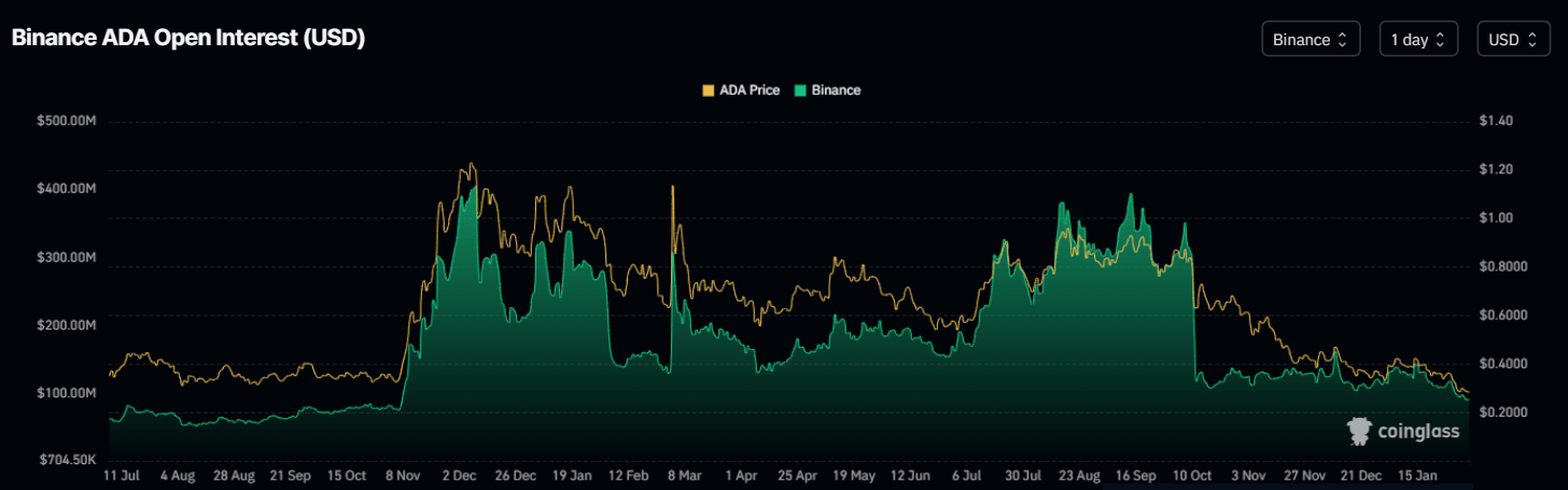 周四,Cardano在币安交易所的期货未平仓合约量(OI)跌至9021万美元,为2024年11月初以来的最低水平,并且自1月中旬以来持续下降。OI的下降反映出投资者参与度的减弱,预示着看跌的前景。