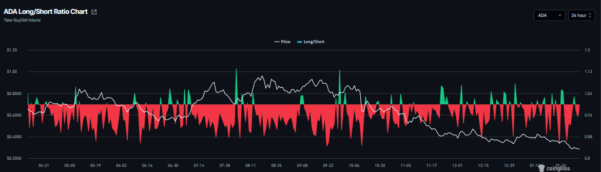 此外,CoinGlass周四公布的ADA多空比为0.95。该比率低于1,反映出市场看跌情绪,因为更多交易者押注该资产价格下跌。