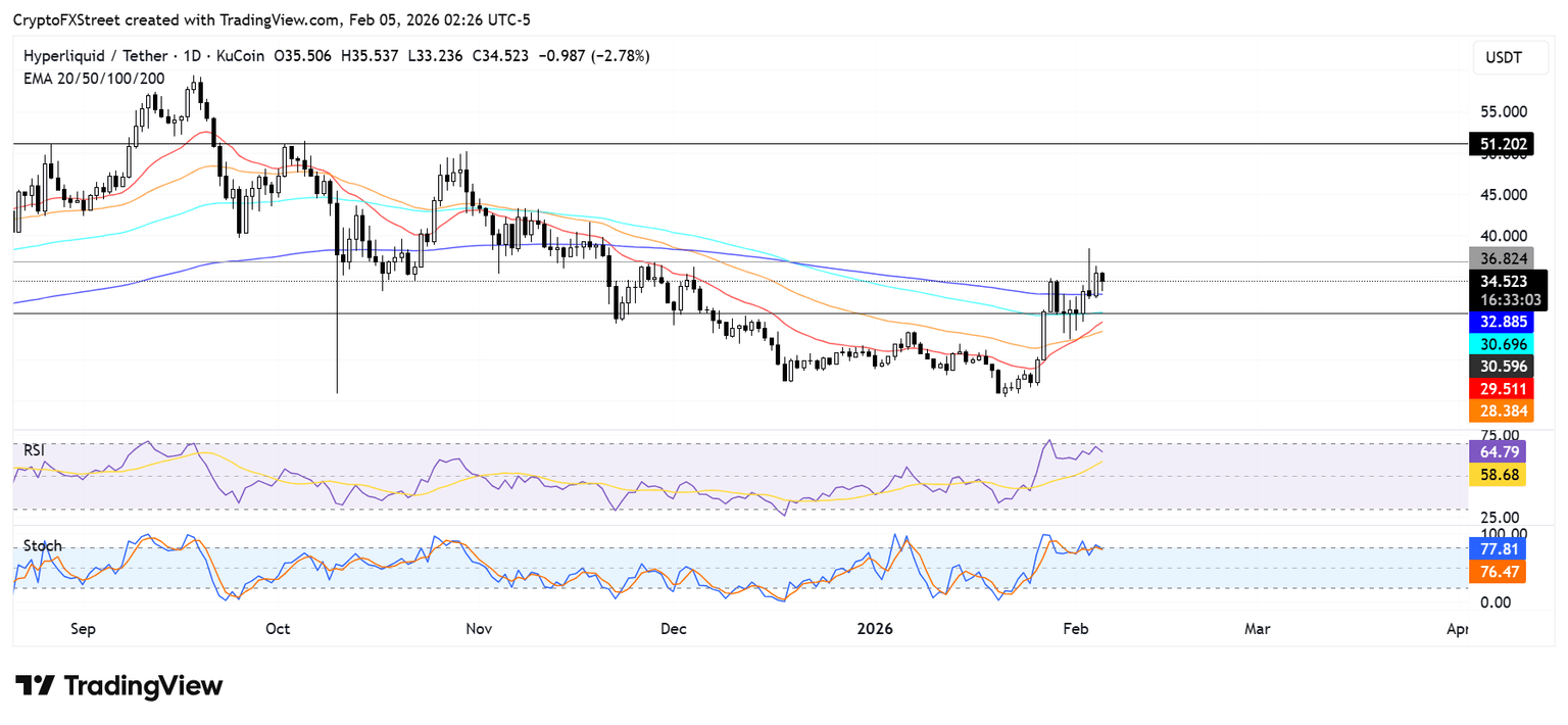消息公布后,HYPE股价在200日指数移动平均线(EMA)附近反弹,周三涨幅超过8%。但上涨势头正在减弱,HYPE在36美元附近受阻后回落部分涨幅。截至发稿时,HYPE股价为34.6美元,过去24小时内上涨3%。