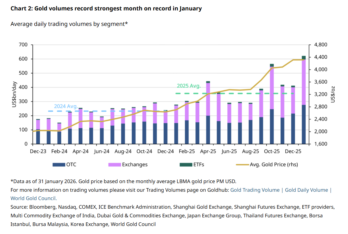 1月份,全球黄金市场日均交易量飙升至6230亿美元,环比大增52%,较2025年平均水平高出72%(图表2)。