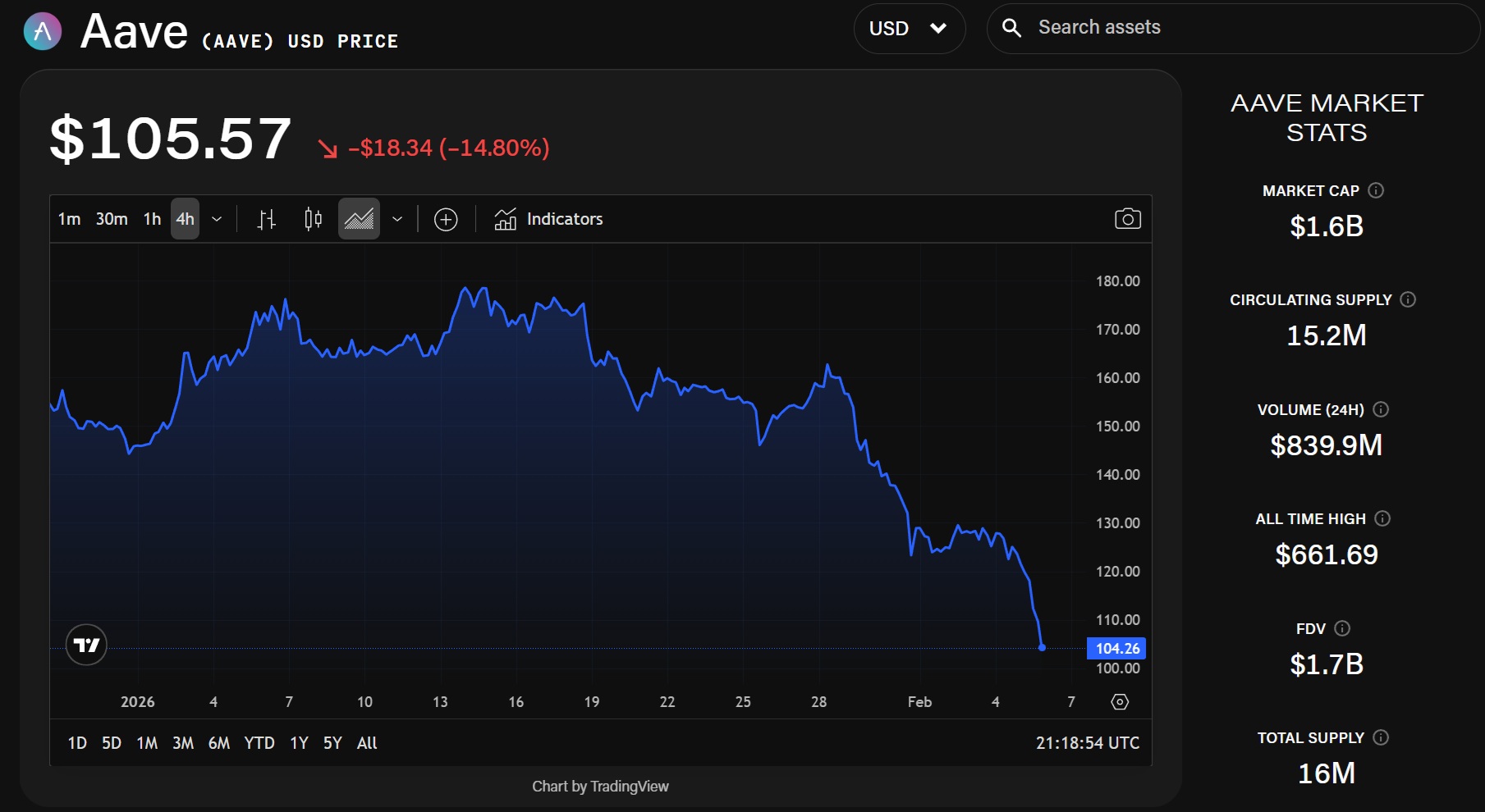 根据数据,AAVE 目前交易价格为 105.60 美元。街区价格 数据显示,当日下跌15%。此外,周四其他主要加密货币,如比特币和以太坊,也都出现了下跌。棚跌幅超过 13%,交易价格跌至数月低点,而许多市值较小的山寨币表现更差。