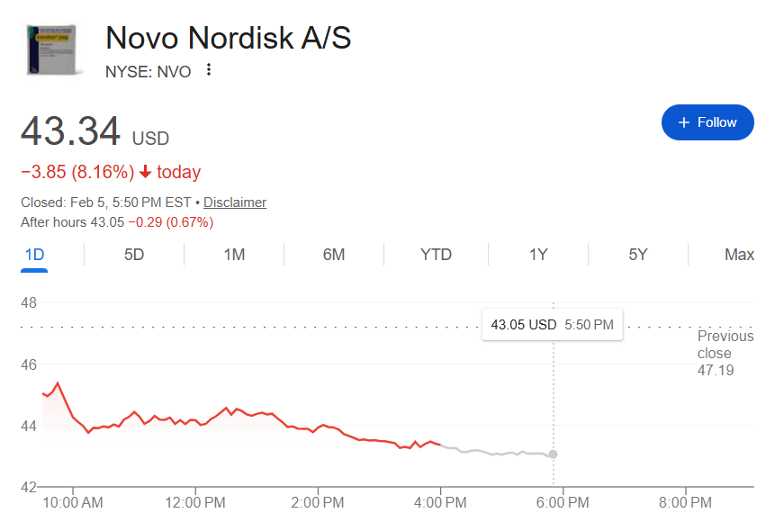 2月5日周四,诺和诺德股价重挫,此前远程医疗公司Hims & Hers Health推出了诺和诺德减肥药Wegovy片剂的仿制版本,定价仅为首月49美元,随后每月99美元,远低于诺和诺德的品牌药物149美元的起始月费。