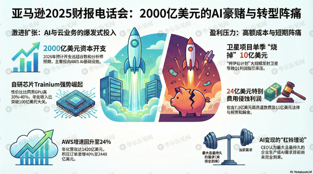 在美股科技股正经历“AI恐慌”与杀估值的敏感时刻,亚马逊的这一指引引发了盘后股价超11%的剧烈震荡。然而,在长达一个小时的电话会议中,亚马逊高管团队,特别是CEO Andy Jassy,用了大量篇幅来论证这种激进投入的必要性,并在自研芯片、AI变现逻辑以及与OpenAI的合作等方面释放了大量增量信息。