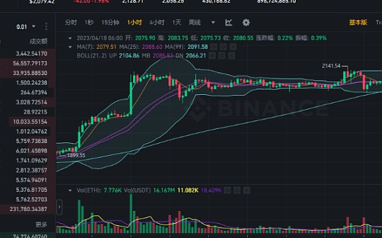 大饼利空以太并没有,很明显截止发稿前,以太日K线最高2120,最低2055,底部支撑还没有破,点位刚好在昨日预测范围以内,EMA依旧在向上拉伸,目前想要破前高,日内不会出现,MACD放量上行开口,KDJ向下收口K线受阻2050,加上K线已经回到了布林通道内部,横盘趋势较强