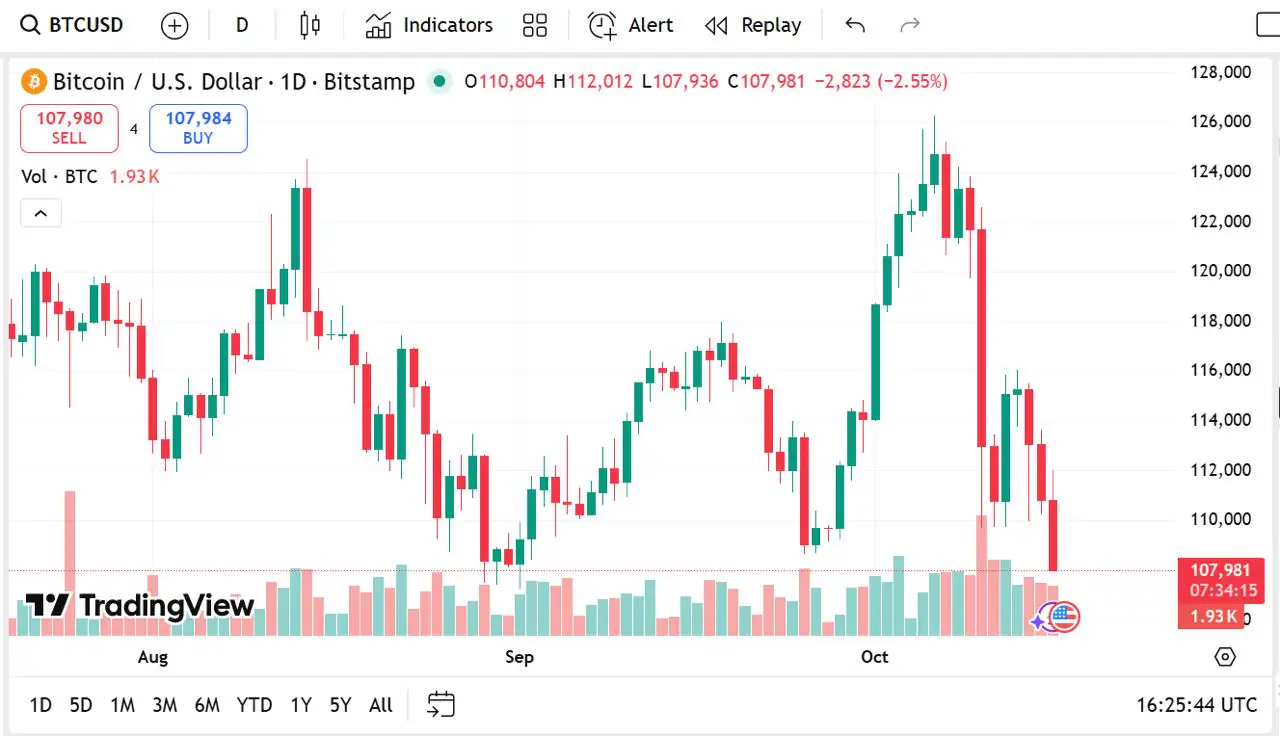 比特币目前价格为 107,980 美元,过去 24 小时内下跌 0.21%,交易量为 733.9 亿美元,而前一天则大幅下跌约 10.35%。即使短期交易活动低迷,该资产仍是顶级数字资产和机构持股之一。