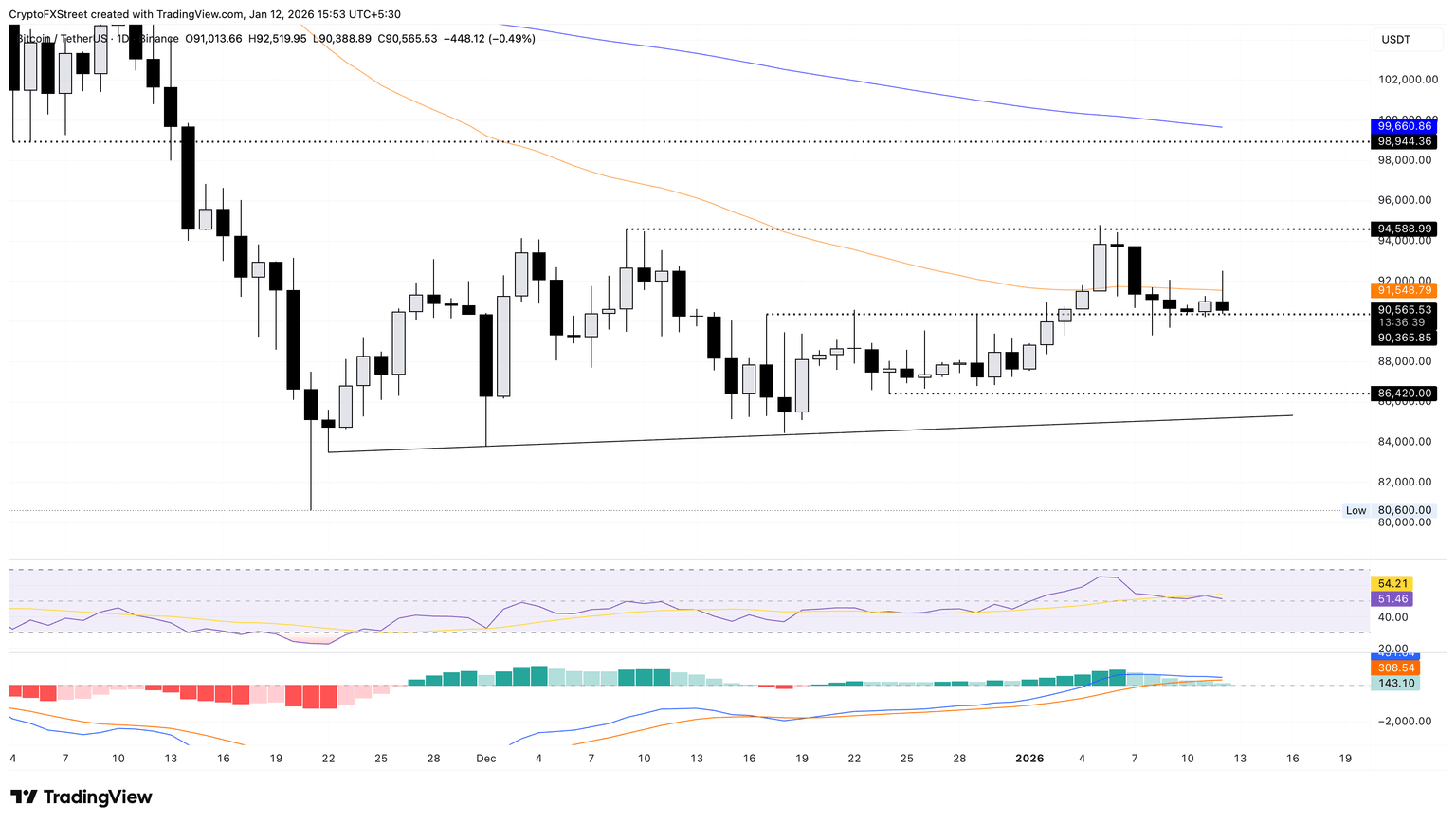 截至周一发稿时,比特币价格回落至 91,000 美元以下,此前盘中一度触及 92,519 美元的高点。此次回调反映出上方阻力强劲,并凸显了 91,548 美元附近的 50 日均线是一个关键且直接的阻力位。