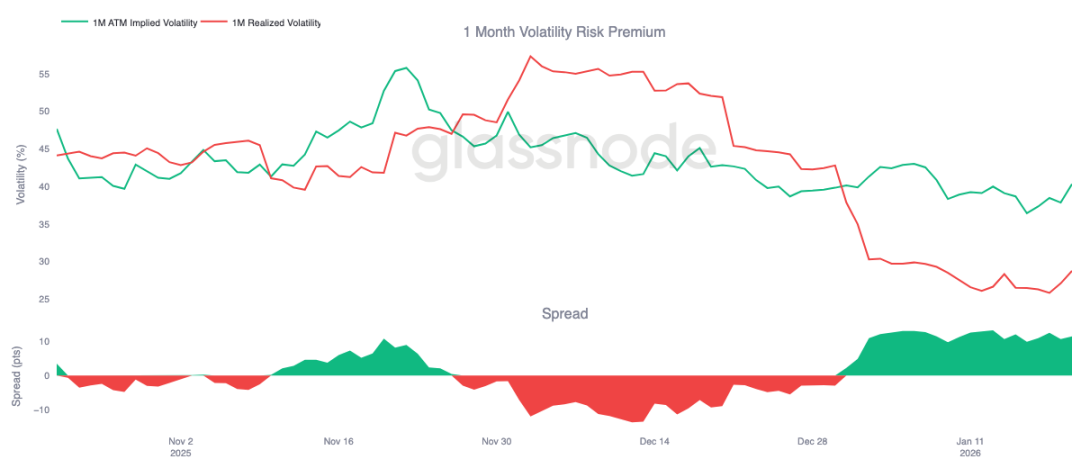 这种动态会自我强化,抑制波动率上升。只要卖出波动率有利可图,就会有更多参与者加入,从而将隐含波动率压制在较低水平。截至 1 月 20 日,一个月期波动率利差约为 11.5 个波动率点,有利于卖方,这充分说明了当前环境对卖出波动率行为依然友好。