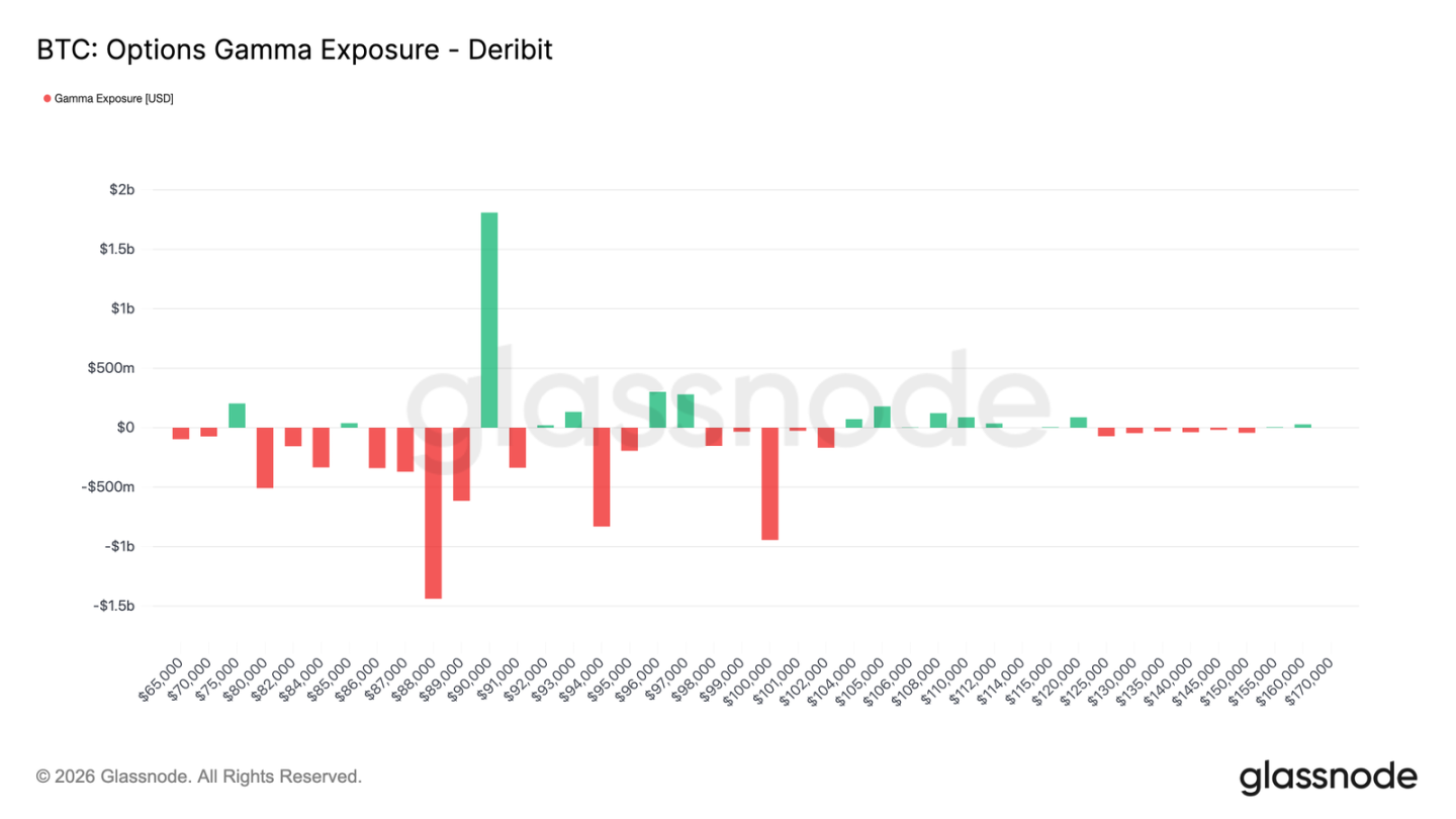 因此,价格在 9 万美元下方的表现可能依然脆弱,而 9 万美元本身将成为一个关键摩擦点。要有效且持续地突破该水平,需要足够的市场动能和信心来消化交易商的对冲资金流,并将其伽马风险敞口推至更高价位。