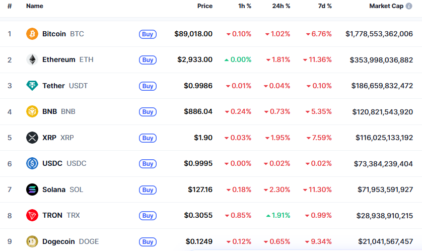 比特币(BTC): 比特币交易股价约为 89,131 美元,今日下跌近 0.90%,过去一周下跌约 7%。日交易量暴跌 28.88% 至 358 亿美元,表明短期交易活动显著下降。