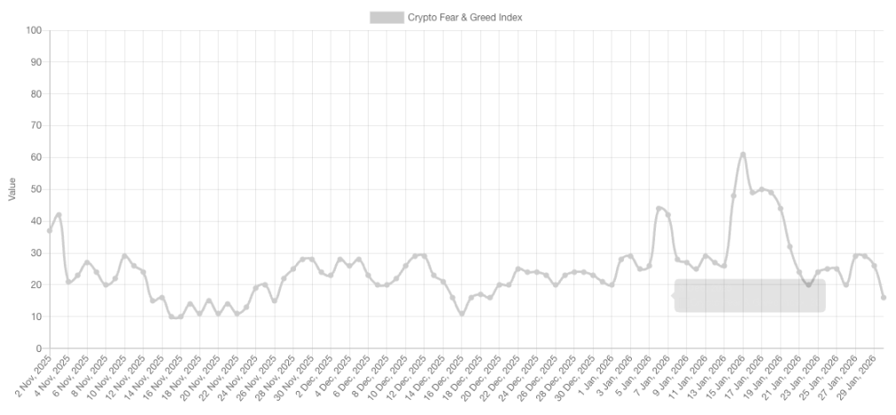 据 Alternative.me 数据,今日加密货币恐慌与贪婪指数降至 16(昨日该指数为 26「恐慌状态」),表明市场从「恐慌状态」转换为「极度恐慌状态」。