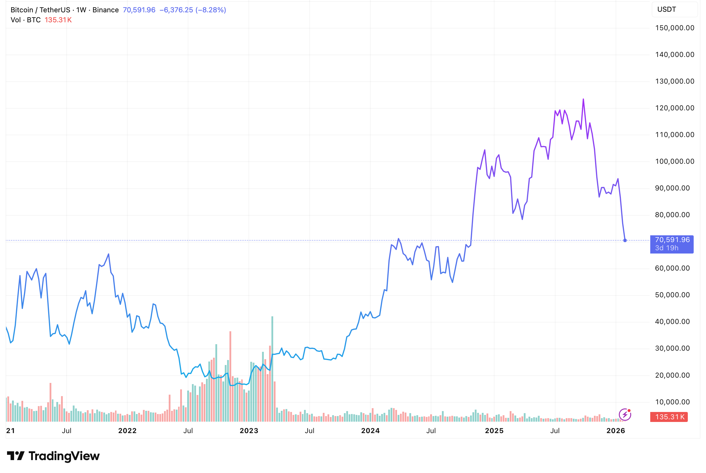 根据图表显示,比特币价格在2025年中期达到峰值,略高于12万美元,之后涨势急转直下。自该高点以来,价格已跌至目前的70,600美元附近,较周期峰值下跌约41%。
