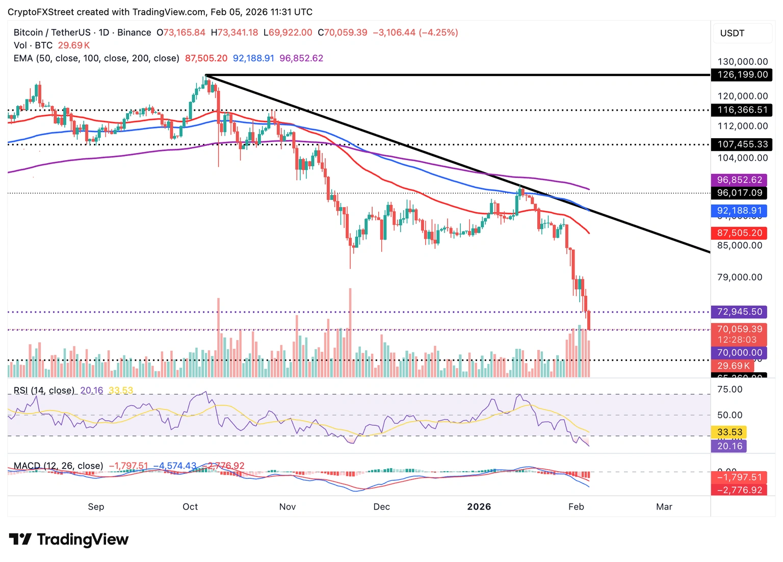 周四,比特币 (BTC) 价格跌破 7 万美元,今年以来已累计下跌近 20%。市场动能转为极度看跌,技术指标显示价格将进一步下探至下一个关键支撑位 6.5 万美元。