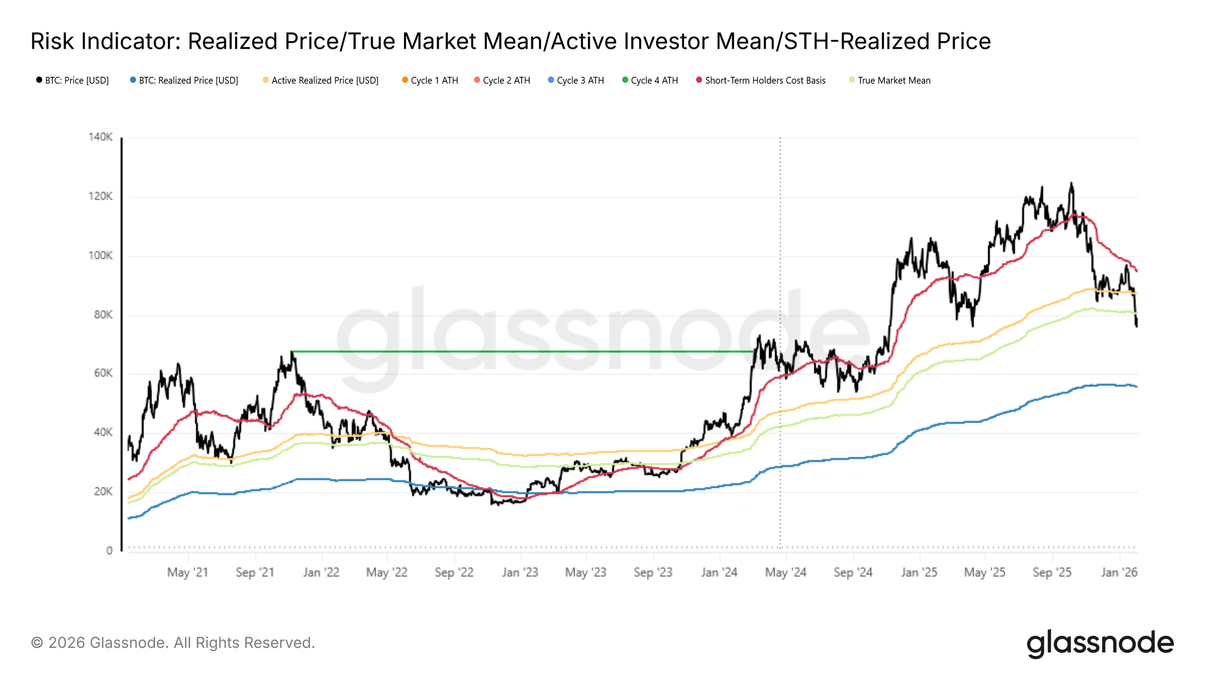 比特币价格下跌已跌破其“真实市场均值”(True Market Mean)——这是一项关键的链上成本基础指标,用于追踪活跃流通供应的平均获取价格。Glassnode 表示,跌破这一水平证实了自 2025 年末以来一直在酝酿的更广泛的崩盘趋势,市场越来越像以往熊市过渡的早期阶段。