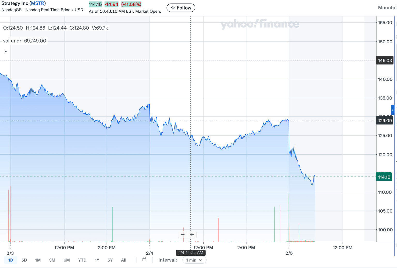 战略(MSTR)作为比特币(BTC)的最大企业持有者,MSTR在周四的财报电话会议前备受关注,此时加密货币市场抛售潮仍在加剧。同样受到冲击的还有MSTR的股票,截至发稿时,股价为114美元,盘中跌幅超过12%。