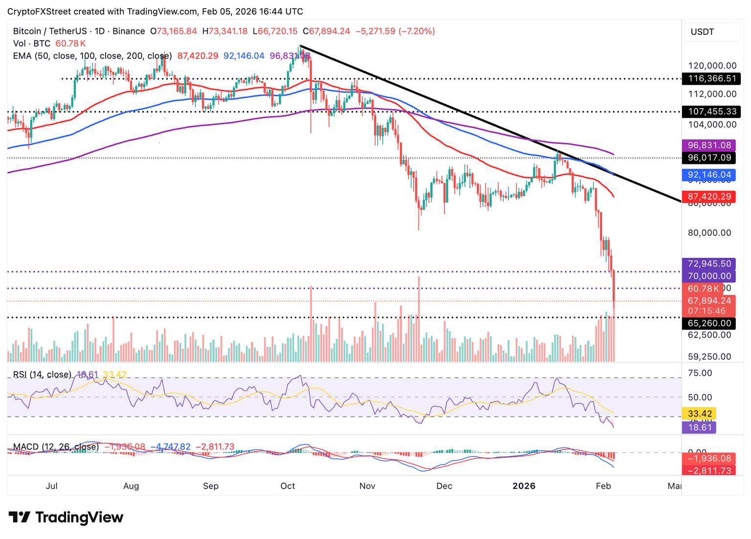 同样,相对强弱指数(RSI)为18.6,表明市场处于超卖状态,并确认了看跌观点。前景此外,移动平均收敛/发散指标(MACD)仍低于其信号线,红色柱状图不断扩大,促使投资者降低风险敞口。若跌破 67,000 美元的直接支撑位,比特币将面临延续下跌趋势并自 2024 年 11 月以来首次测试 65,000 美元需求区的风险。
