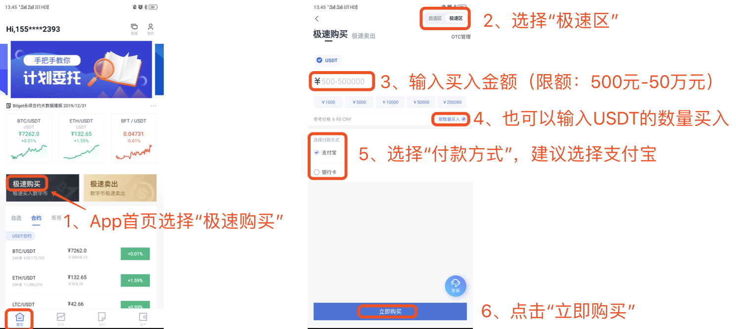1)在APP“首页”选择“极速买入”-进入购买页面-选择“极速区”-输入或者选择交易金额(最小交易金额为500元人民币)---选择卖家所支持的付款方式(银行卡提示广告不足,建议您使用支付宝)---点击“立即购买”