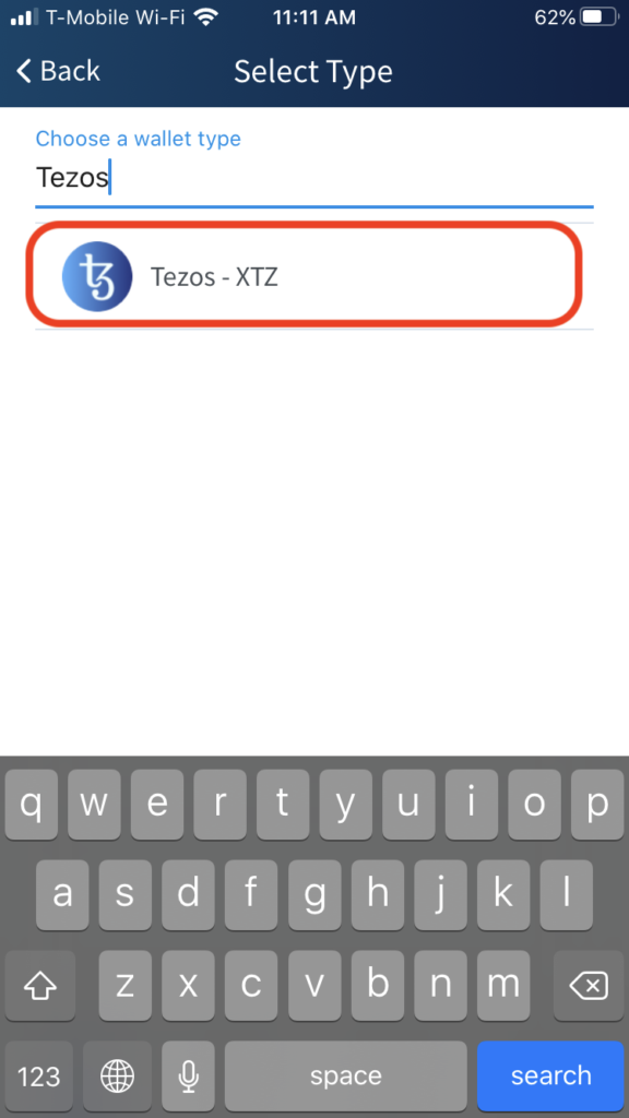 输入钱包类型“ Tezos”,然后点击“ Tezos”选项。