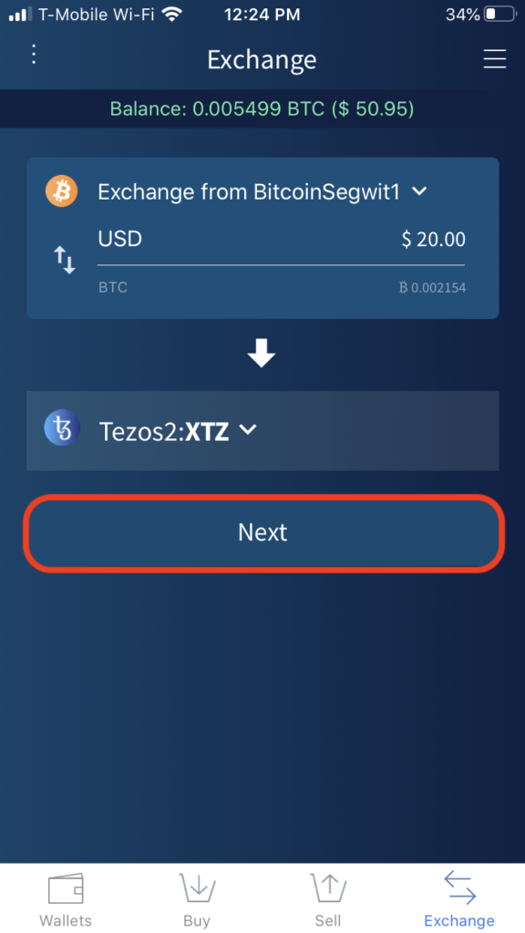 选择一个Source Wallet,然后选择您的Tezos钱包作为“ Receiving Wallet”,然后点击“ Next”。