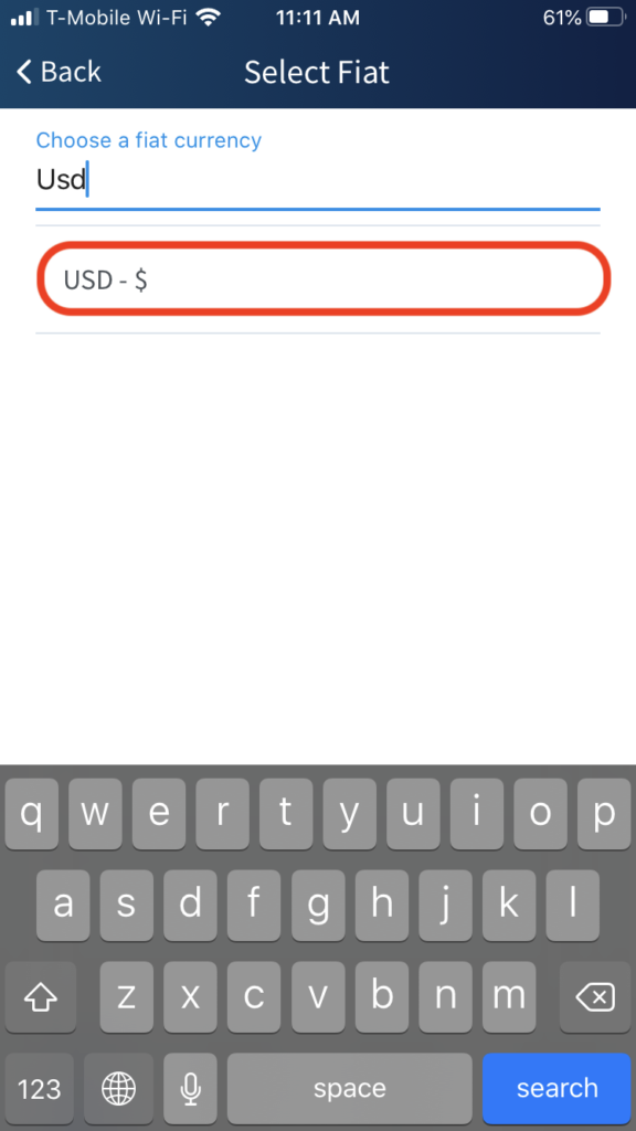 输入并搜索要使用的法定面额。我选择了美元作为法定货币。您可以选择任何可用的。