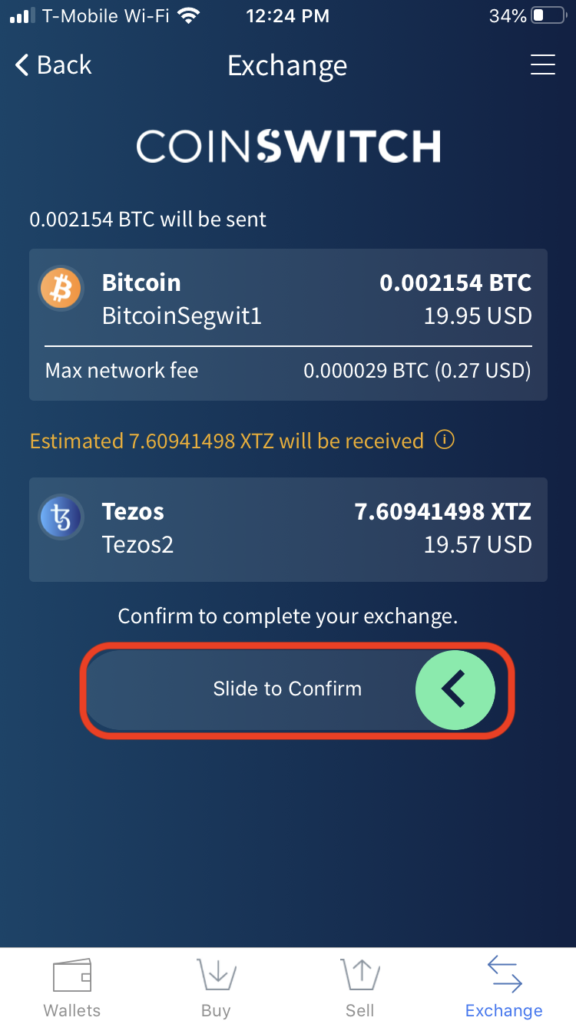 我们的交换合作伙伴Coinswitch赢得了执行此次交换的权利。准备好后,“滑动确认”。