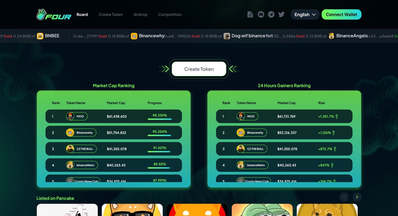 Four.meme 作为 BNB 链上的发行平台,从项目名称到品牌 LOGO 都能看出与 BNB 的关联,其化用了 CZ 的经典手势「Four」。此外,4chan 作为 Memecoin 在 Web 2 的发酵平台或许也影响了 Four.meme 的品牌名。不论是从团队创始人发言还是各类活动来看,Four.meme 都获得了 BNB Chain 不小的助力。其与 FOUR 代币合作推出空投活动,用户在平台指定页面完成相关任务即可获得积分,积分可兑换 BNB Chain 生态 Meme 币 FOUR 和 WHY。该活动获得 BNB Chain 支持和转发,受此消息影响,FOUR 在 24H 涨幅超 65%。8 月中,Four.Meme 开始举办 Meme 创建大赛,总奖池包括 100 万个 Four.Meme 积分和价值 2 万美元的 Meme 代币,邀请到了 In2Ventures 创办人 Bili、NBA 明星 Tristan Thompson 、WHY、FOUR 团队,作为裁判嘉宾。