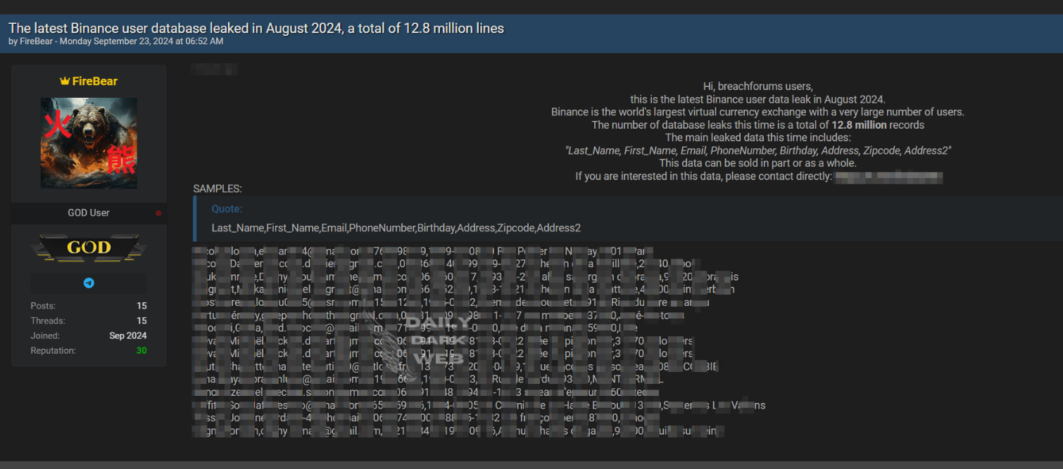 当CZ努力解决法律问题时,币安面临着另一个挑战。2024年9月,有报告称,一次大规模数据泄露可能影响超过1200万用户。币安迅速否认了这些指控。